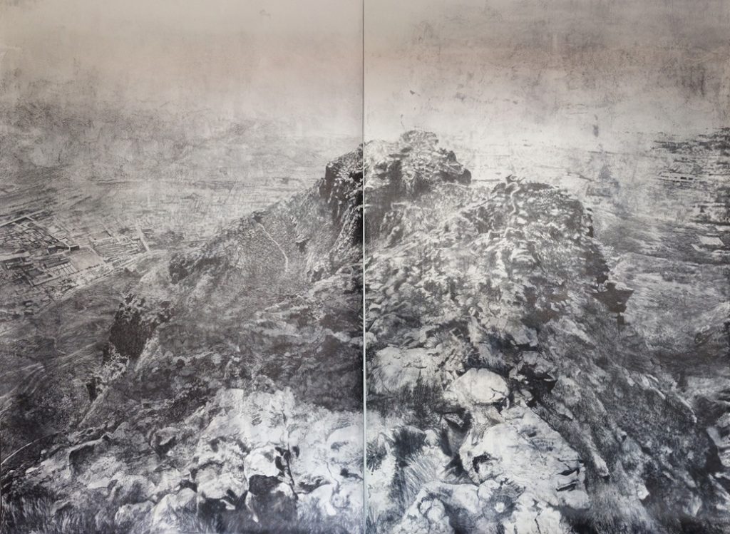 The title of the exhibition is illustrative of Rhett Martyn’s approach to landscape painting. The artist uses images of landscapes shared by hikers, which he redraws and then dissolves with the help of chemical solvents and erasers. After the image’s partial destruction, Martyn reconstructs its various parts and repeats the process of erasure and reconstruction multiple times.